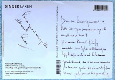 kaart is van haar bezoek aan de Dufy-expo in het Singer in Laren die duurde tot