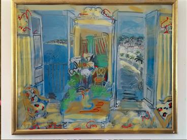Colored edges had appeared under the frame. I searched online to see what the original had looked like. With little effort, I found images of Interieur à Deux Fenetres à Nice. It was originally a lithograph, 65.3 by 54 cm, in strong red and blue contrasts. Small, and a color scheme that, to be honest, never appealed to me. But anyway, all the red, yellow, and mixed shades were now gone. Only blue and black remained.